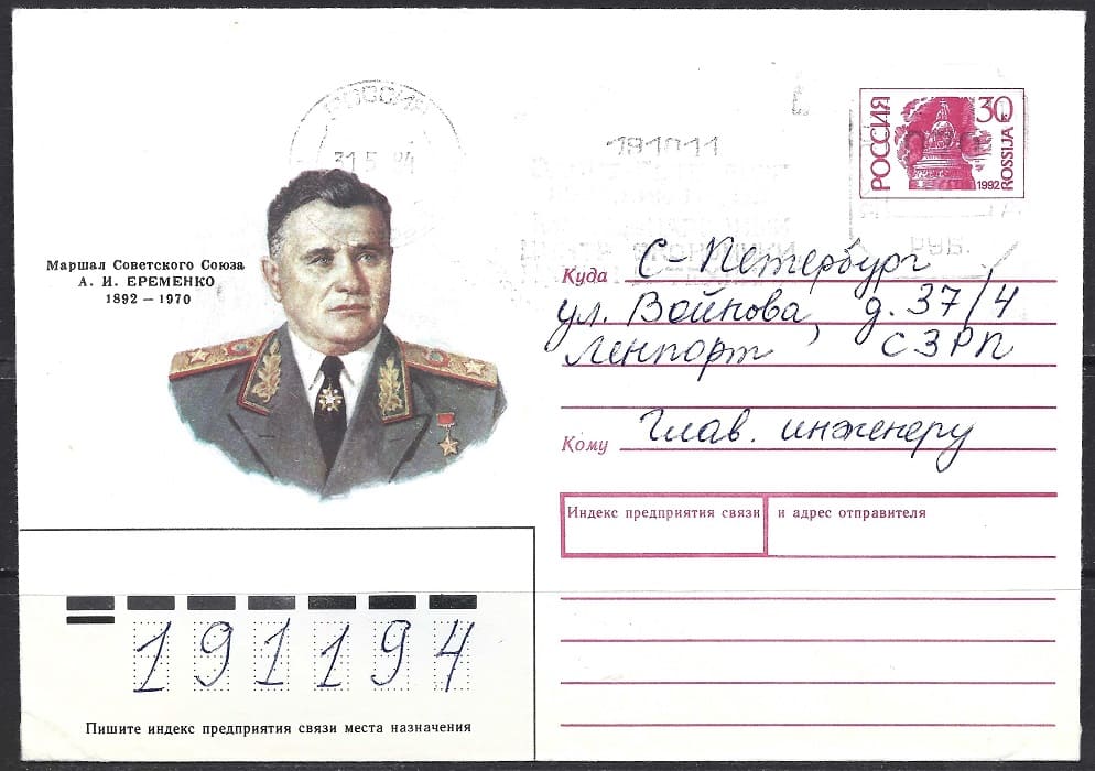 Конверт Маршал Советского Союза А.И. Еременко. 12.03.1992 год. Прошел почту.