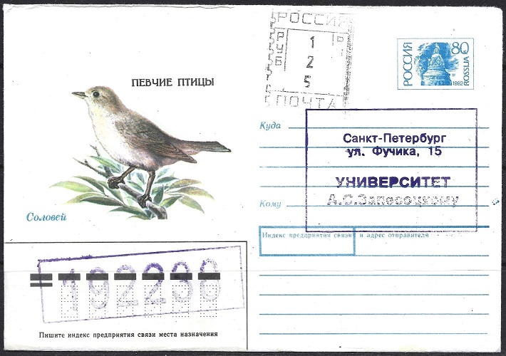 Конверт Певчие птицы. Соловей (1). 10.07.1992 год. Прошел почту.