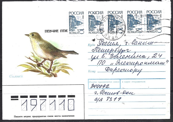 Конверт Певчие птицы. Соловей (2). 10.07.1992 год. Прошел почту.