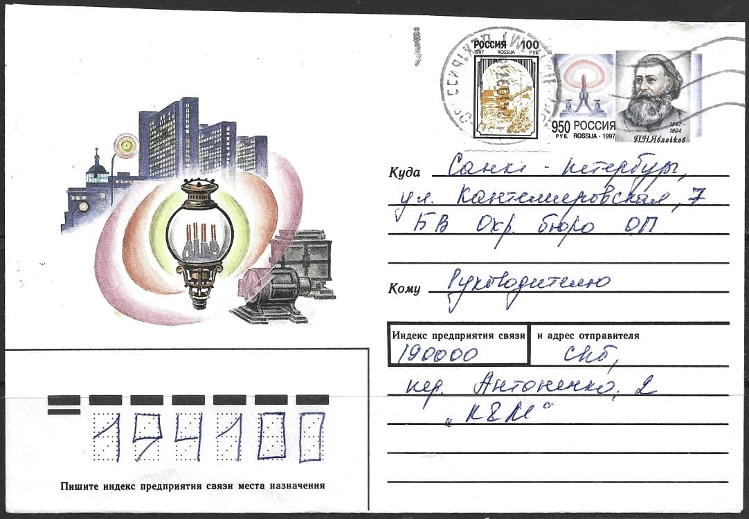 Конверт П.Н. Яблочков русский электротехник, инженер, изобретатель. 18.02.1997 год. Прошел почту.