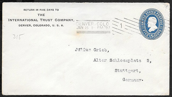 Конверт прошел почту США 1897 год. Дэнвер - Штутгарт, марка 5 центов, с ВЗ