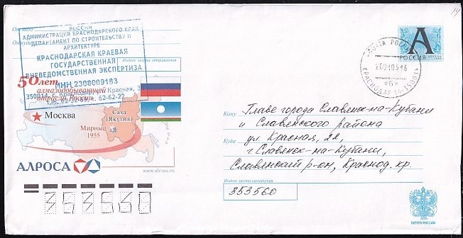 Конверт с лит. А 50 лет алмазодобывающей отрасли России. АЛРОСА, 2004 год, прошел почту