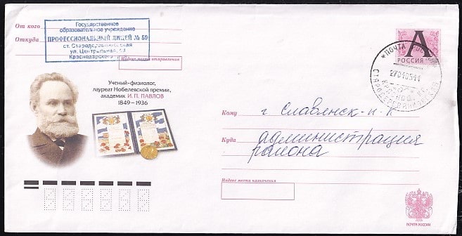 Конверт с лит "А" Академик И.П. Павлов. Выпуск 11.12.2003 год, прошел почту