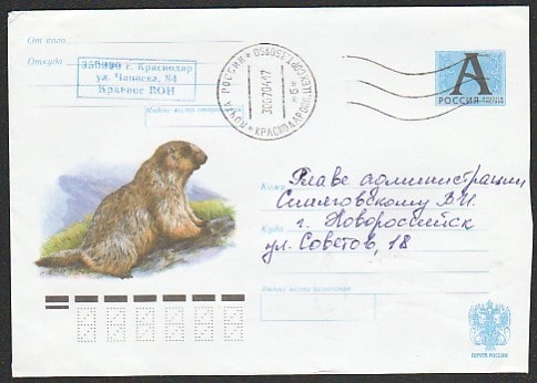 Конверт с литерой "А". Нутрия, 24.12.2002 год, п/почту (I)