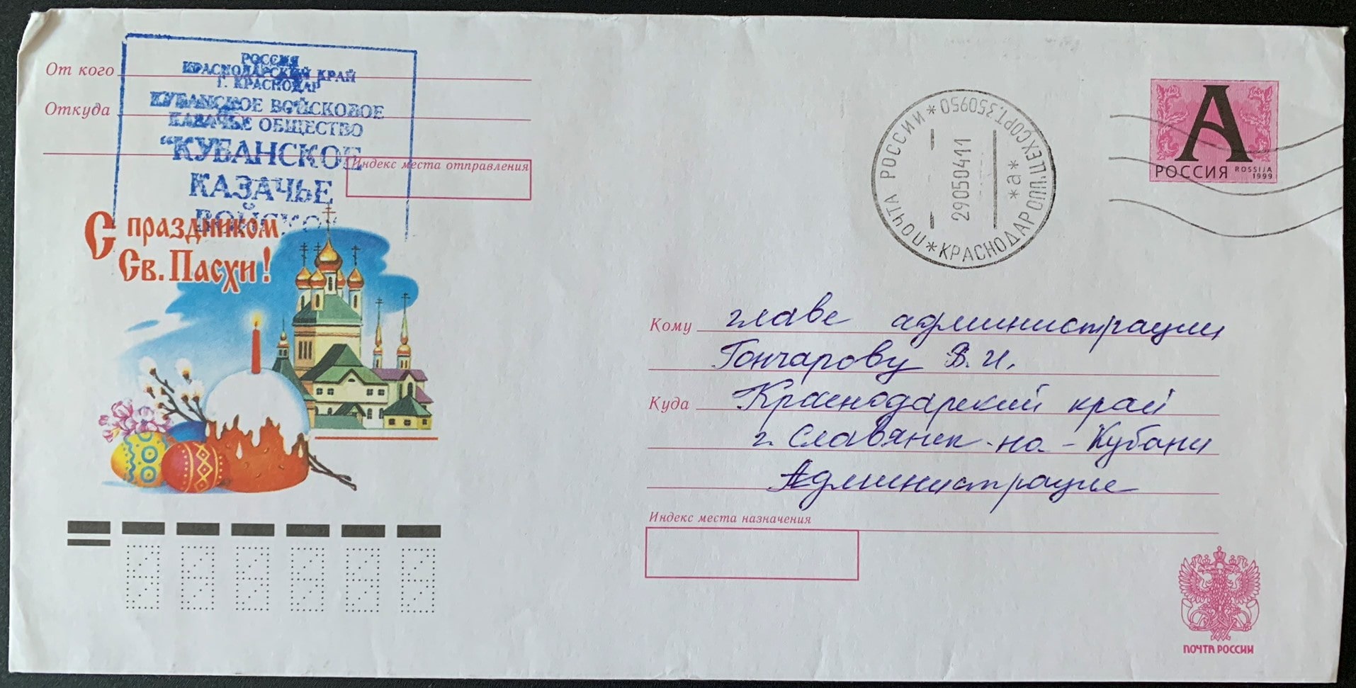 Конверт с литерой "А" - С праздником Св. Пасхи! 24.09.2003 год, прошёл почту