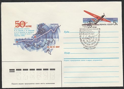 Конверт с ОМ и гашением первого дня. 50 лет беспосадочному перелёту Москва - Портленд, 18.06.1987 год, Москва, почтамт