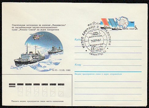 Конверт с ОМ и СГ. Музей Арктики и Антарктики, 18.06.1987 год, Ленинград-40.
