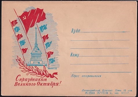 Конверт С праздником Великого Октября! Выпуск 26.07.1956 год