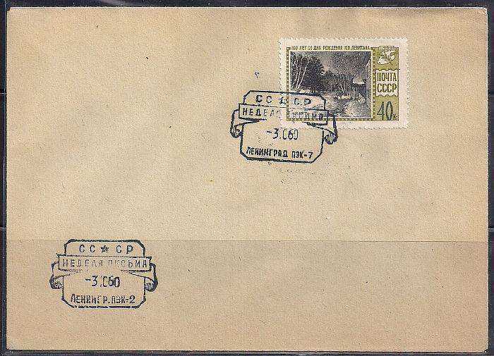 Конверт с СГ. Неделя письма, 1960 год, Ленинград, наклеена марка "100 лет со дня рождения М.И. Левитана"