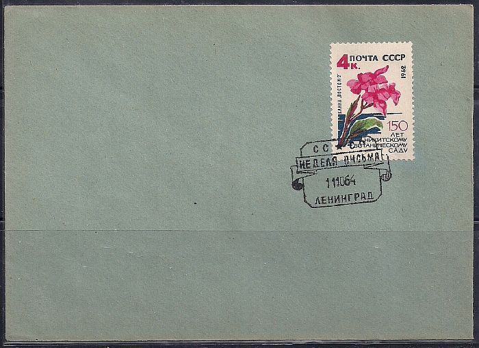 Конверт с СГ. Неделя письма, 1964 год, Ленинград, наклеена марка "Цветок канна "Восток-2". 150 лет Никитскому ботаническому саду"