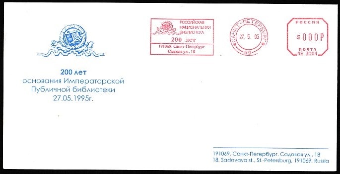 Конверт со спецгашением. 200 лет основания Императорской Публичной библиотеки, 27.05.1995 год, СПб
