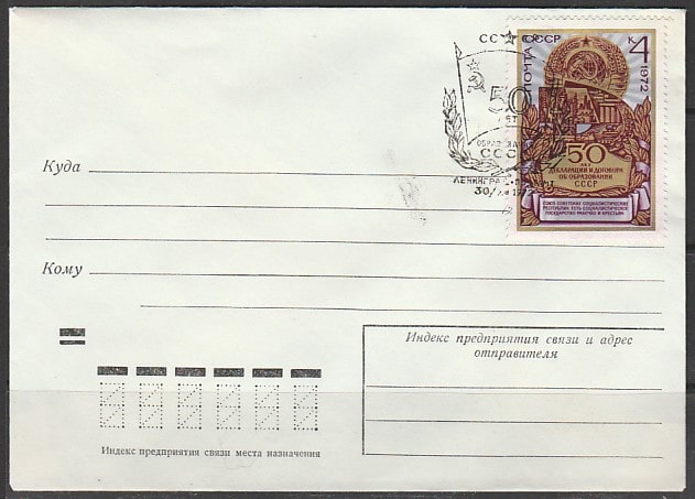 Конверт со спецгашением. 50 лет образования СССР, 30.12.1972 год, Ленинград, почтамт.
