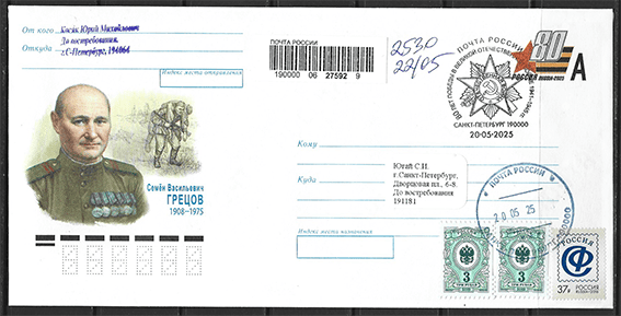 Конверт со спецгашением 80 лет победы в ВОВ, СПб 20.05.2025 год, прошел почту