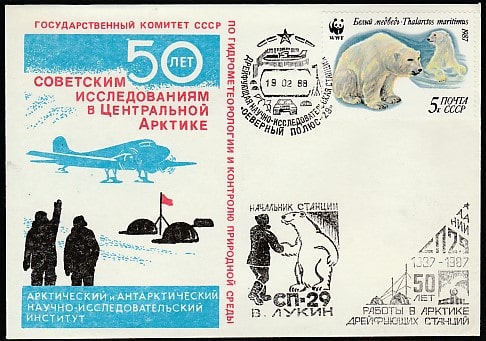 Конверт со спецгашением - Дрейфующая научно - исследовательская станция "Северный полюс-29", 19.02.1988 год