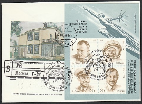 Конверт со спецгашением. Международная выставка "К звёздам-91". День С.П. Королёва, 10.04.1991 год, Москва, Г-34 (+1Ю)