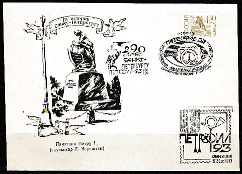 Конверт со спецгашением. Памятник Петру I Л. Бернштама. Российская филвыставка "Петрофил-93", 22-30.05.1993 год, СПб, почтамт (III) КШ: 290 лет СПб. "Петрофил-93".