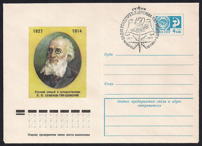 Конверт со СГ. 150 лет Семенова-Тян-Шанского. Гашение 14.01.1977 г. Ленинград, почтамт