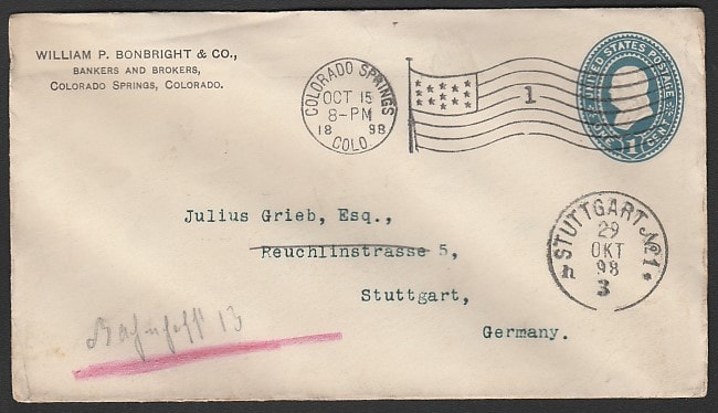 Конверт США от брокерской конторы, прошёл почту в 1898 году, Колорадо - Штутгарт, марка 1 цент