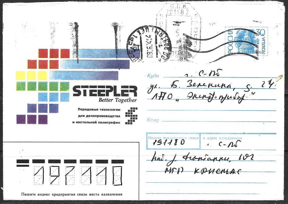 Конверт Steepler. Передовые технологии для делопроизводства и настольной полиграфии. 22.06.1992 год. Прошел почту.