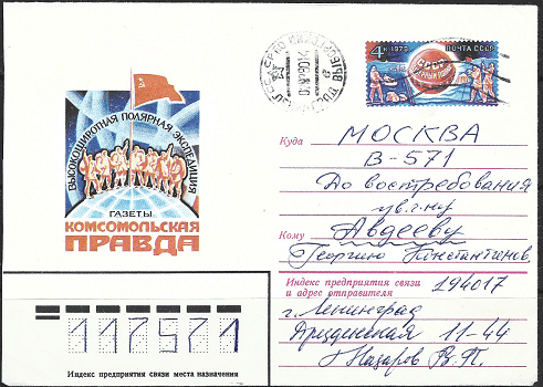 Конверт Высокоширотная полярная экспедиция газеты Комсомольская Правда.26.09.1979 год. Прошёл почту.