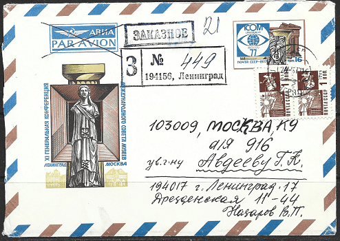 Конверт XI Генеральная конференция международного совета музеев. Ленинград-Москва. 04.04.1977 год. Прошёл почту