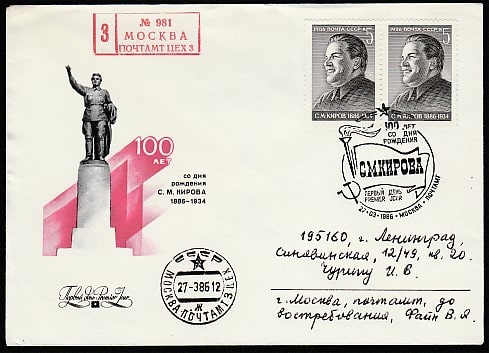 КПД. 100 лет со дня рождения государственного деятеля С.М. Кирова, 27.03.1986 год, Москва, почтамт, прошёл почту