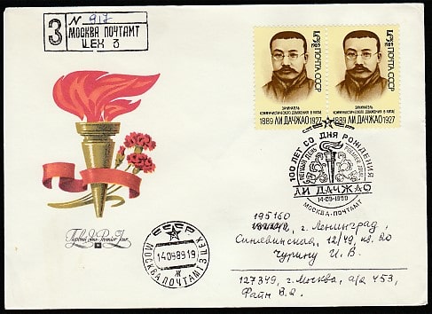 КПД. 100 лет со дня рождения китайского политика Ли Дачжао, 14.09.1989 год, Москва, почтамт, заказное, прошёл почту