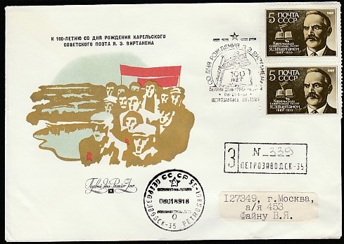 КПД. 100 лет со дня рождения поэта Я.Э. Виртанена, 08.01.1989 год, Петрозаводск, почтамт, заказное, прошёл почту