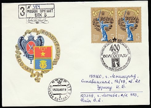 КПД. 400 лет Волгограду, 05.05.1989 год, Москва, почтамт, заказное, прошёл почту
