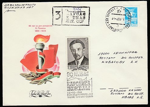 КПД. 90 лет со дня рождения политического деятеля Литвы Каролиса Пожелы, 28.02.1986 год, Каунас, почтамт, прошёл почту