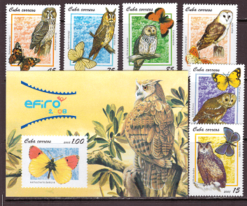 Куба 2008 год Фауна Птицы Совы БАБОЧКИ. 6 марок и Блок