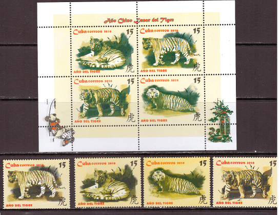 Куба 2010г. Тигры. Китайский Новый год - год тигра. 4 марки и блок (лист).