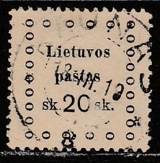 Литва 1919 год. Стандарт. Номинал в кольцевом квадрате, ном. 20 sk, 1 марка из серии (гашёная) (1 из 7) (Х/4,5/3)