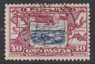 Литва 1934 год. Карта авиамаршрута Америка-Европа. Самолёт, 1 марка из серии (гашёная)