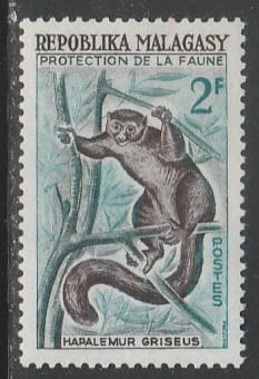 Мадагаскар 1961 год. Лемуры: короткий серый лемур, ном. 2 Fr, 1 марка из серии.