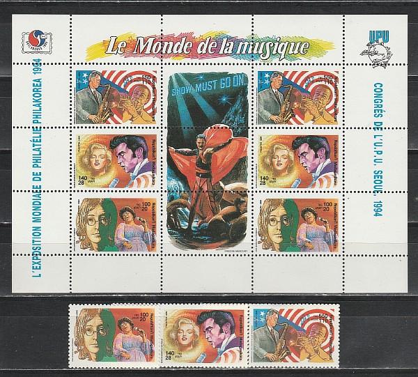 Известные, Музыканты, Певцы, Мадагаскар 1994, 3 марки + малый лист