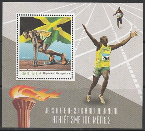Мадагаскар 2016 год. Олимпиада. Лёгкая атлетика: бег на 100 метров, блок. Сувенирный выпуск.