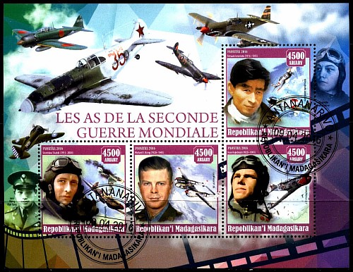 Мадагаскар 2016 год. Самолеты. Известные военные летчики. Гашеный малый лист