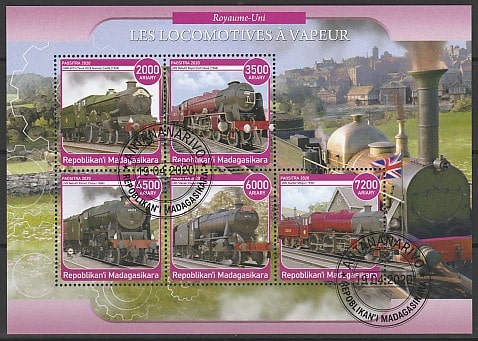 Мадагаскар 2020 год. Паровозы (II), малый лист (гашёный) зАЛОМЫ УГЛОВ Сувенирный выпуск.