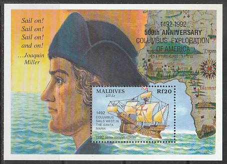 Мальдивы 1993 год. Парусник Христофора Колумба "Санта-Мария", блок.