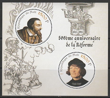 Мали 2017 год. Протестантские реформаторы: Жан Кальвин и Ульрих Цвингли, малый лист.