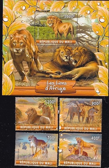 Мали 2020 год. Африканские львы, блок и 4 марки