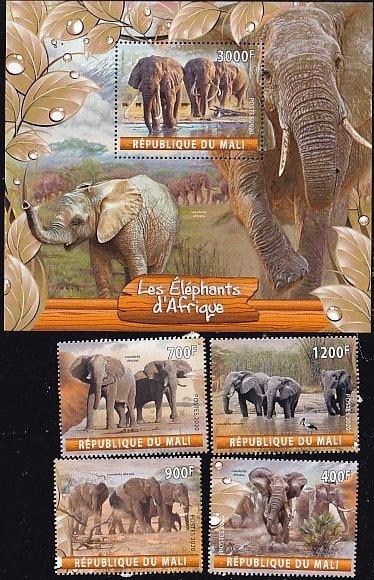 Мали 2020 год. Африканские слоны, блок и 4 марки
