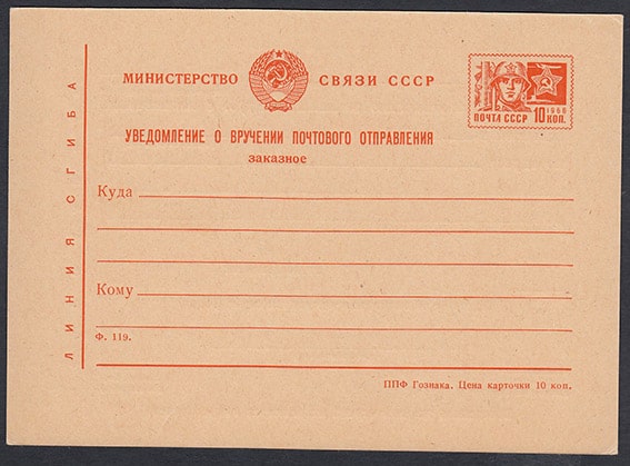 Министерство СССР. Уведомление о вручении почтового отправления. Заказное. Марка 10 копеек. 1970 год