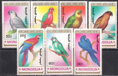 Монголия 1990 год. Попугаи. 7 марок