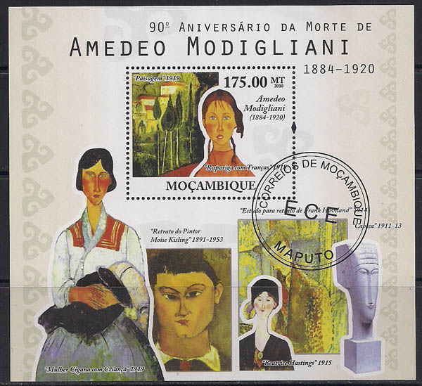 Мозамбик 2010 год. 90 лет со дня смерти художника-экспрессиониста А. Модильяни. 1 гашёный блок