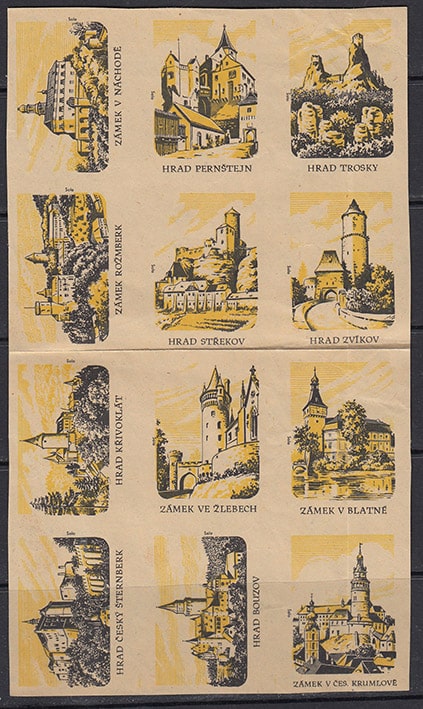 Набор иностранных спичечных этикеток. Чехия. Замки, 12 штук, желтые на желтой бумаге