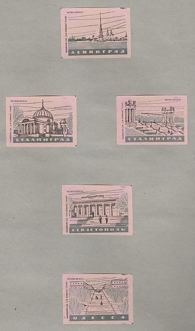 Набор спичечных этикеток. Архитектура городов воинской славы (I), 1960 год, 5 штук (розовые)