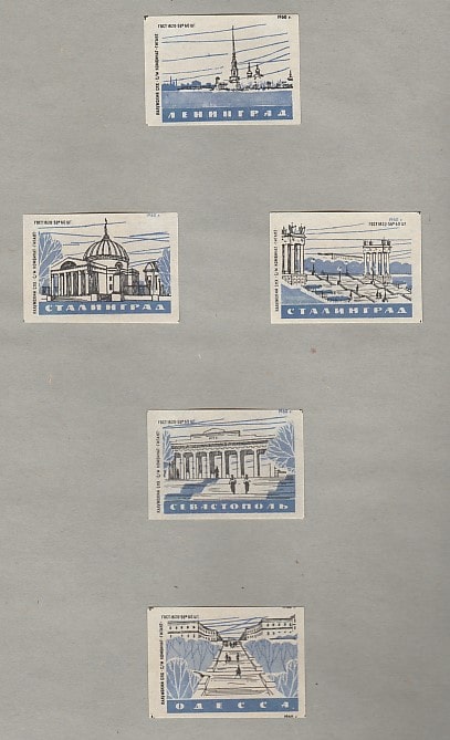 Набор спичечных этикеток. Архитектура городов воинской славы (I), 1960 год, 5 штук (синие) Калужский СНХ. Комбинат "Гигант", (наклеены на лист 245/325 мм)