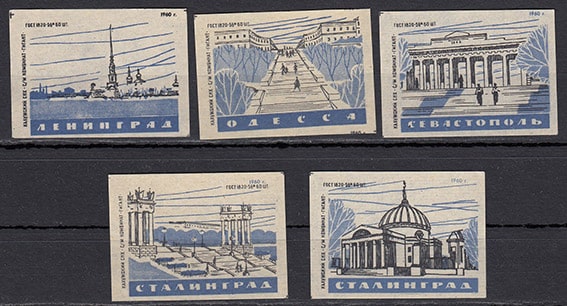 Набор спичечных этикеток. Города, 1960 год, синие на белой бумаге, 5 штук
